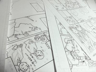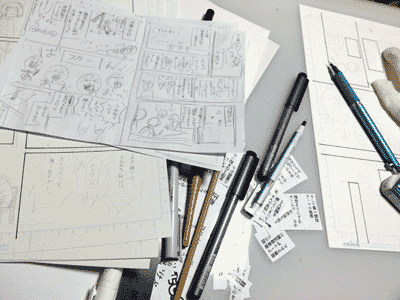 2015/09/28 Category : 日常 部誌原稿と一部道具紹介 10月1日〆切の部誌原稿8ページなんとか間に合いそうです。内容としてはまんが甲子園に参加したきっかけから3位を受賞してスカウト制度や県からのご依頼をいただくまでの経緯をゆるーい絵で漫画にしています。去年は部誌原稿22ページ描いていた私ですが、今年は自重気味です!一応、受験生ですし!やることいっぱいありますし!8ページで我慢だ!そんなこんなで作業してるとき机の上はかなりゴチャゴチャしています。↓こんなかんじ 左上に見えるのがネーム(ラフ)です。真ん中の下らへんに写ってるのが写植(セリフやナレーションを印刷したもの)です。右上の端にあるのは百均で買った綿手袋。たしか運転用?の薄い布手袋で人差し指と親指の第一関節部分だけ切って使っています。※手の汗や油がつくとベタの時にインクを 弾いてしまって綺麗に塗れないので そうならない為の対策です。つけペンは主にGペンを使用。場所に合わせて丸ペン、かぶらペンを使用。なんてことを聞かれてないのに紹介してみました(°▽°)そしてこんな感じの軽いノリのモノなら1日で8ページペン入れできると判明↓ ミスったらミスノン(修正インキ)ありますし!!!最近、漫勉という番組で色んな漫画家さんの描き方を見ていたら勢い良く描く勇気が沸いてきました。今の私は「ガンガンいこうぜ」状態です(°▽°)+※ブログまったりでも更新しようキャンペーンなう [0回]
