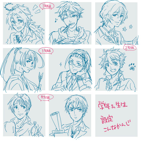 2015/02/28 Category : 日常 キャラサミ学園 登場キャラ 【乙女ゲー風なんちゃってCM動画製作中】 ツイッターでキャラの自薦他薦を していただいたところ 下記のような結果になりました! 【追加登場キャラ】 ●東北ずん子ちゃん ●星田すずらんちゃん ●松本イズミちゃん ●小松姫ちゃん ○ニパ子ちゃん(←攻略対象外ポジ) 【すでに決定済みの登場キャラ】 ●江ノ島さんぽちゃん ●赤杢ぎばさちゃん ●かつめしちゃん 総勢8名ですね! ※彼女たちに男の子になっていただきます! イケメン化する際にネックになるのが 髪飾りなわけですが… ネクタイの柄にしたり ピアスにしたりネックレスにしたり 何かしら別の物に変換させていただくとしましょう! みんな大好きツインテールもごめんなさい! さすがに男なので、ばっさりいかせてもらいます! ================ 『学年&部活or委員会』 ●赤杢ぎばさちゃん(1年生/水泳部) ●かつめしちゃん(1年生/料理部) ●江ノ島さんぽちゃん(2年生/広報部) ●星田すずらんちゃん(2年生/飼育委員) ●松本イズミちゃん(3年生/美化委員) ●東北ずん子ちゃん(3年生/弓道部) ●小松姫ちゃん(社会科の先生) ○ニパ子ちゃん(技術講師) ざっくり今の段階でのイメージだとこんな感じです。 ▼画像でまとめるとこういう学年割り 色々ツッコミどころもあるかと思いますが 何より優先させたいのが動画の完成ということで ちゃっちゃと立ち絵に着手! 試作品みたいなもんやからね(*´ω`*) 作ってみてからいっぱい反省しようかなとw こんなかんじでブログにて 途中経過ちょこちょこ報告していきます!(゚▽゚) [2回]